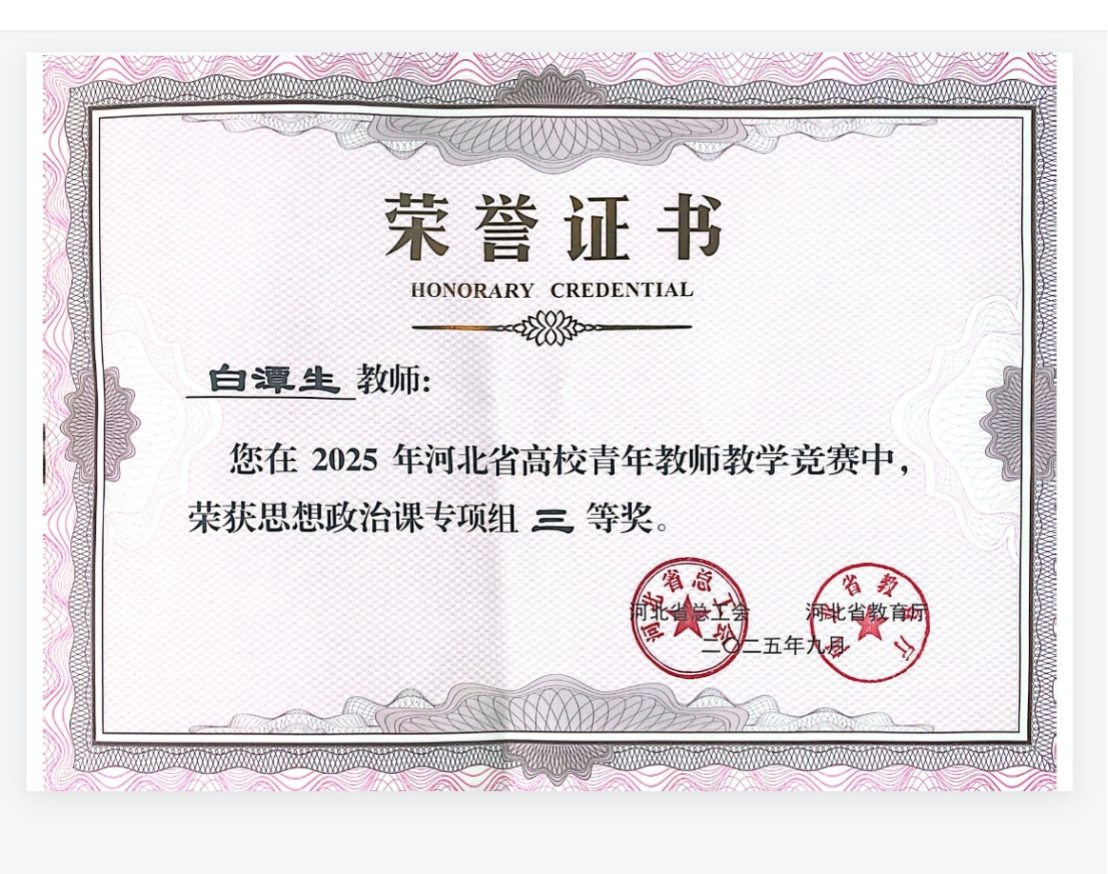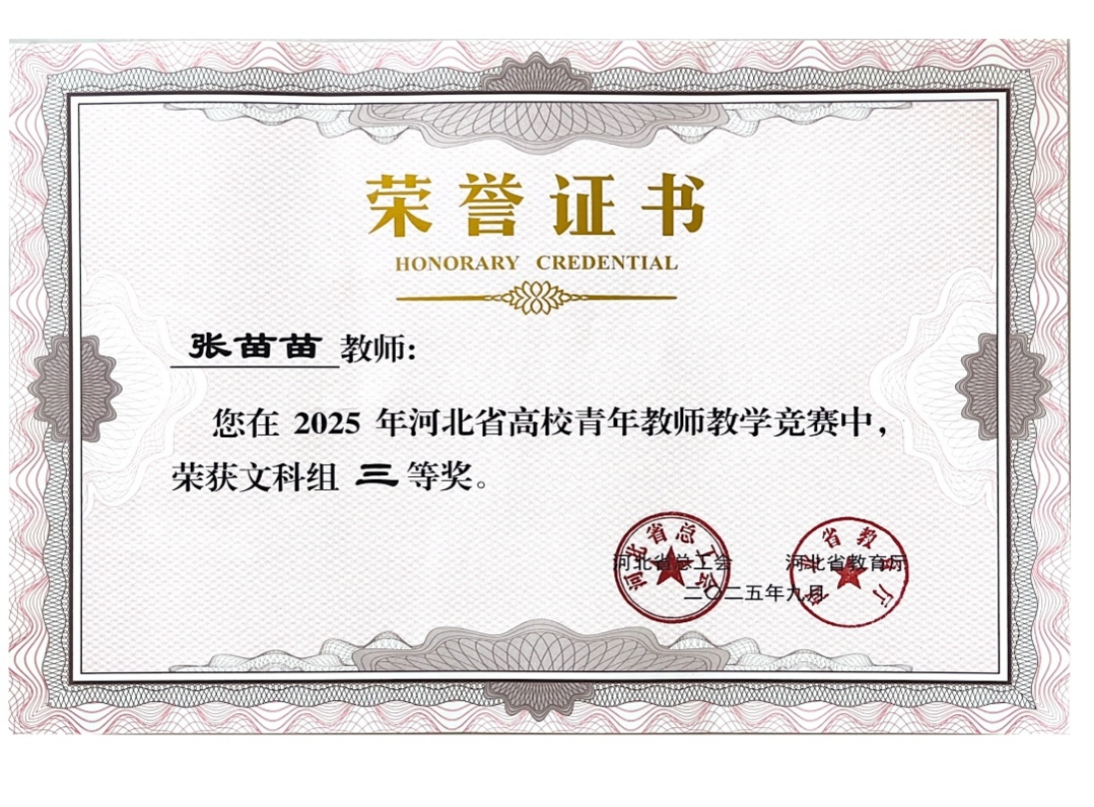 9月30日,河北省总工会和河北省教育厅联合举办的2025年河北省高校青年教师教学竞赛落下帷幕。我校选派的张苗苗老师荣获文科组三等奖,刘欣欣老师荣获工科组三等奖,白潭生老师荣获思想政治课专项组三等奖,充分展现了我校青年教师扎实的教学功底。